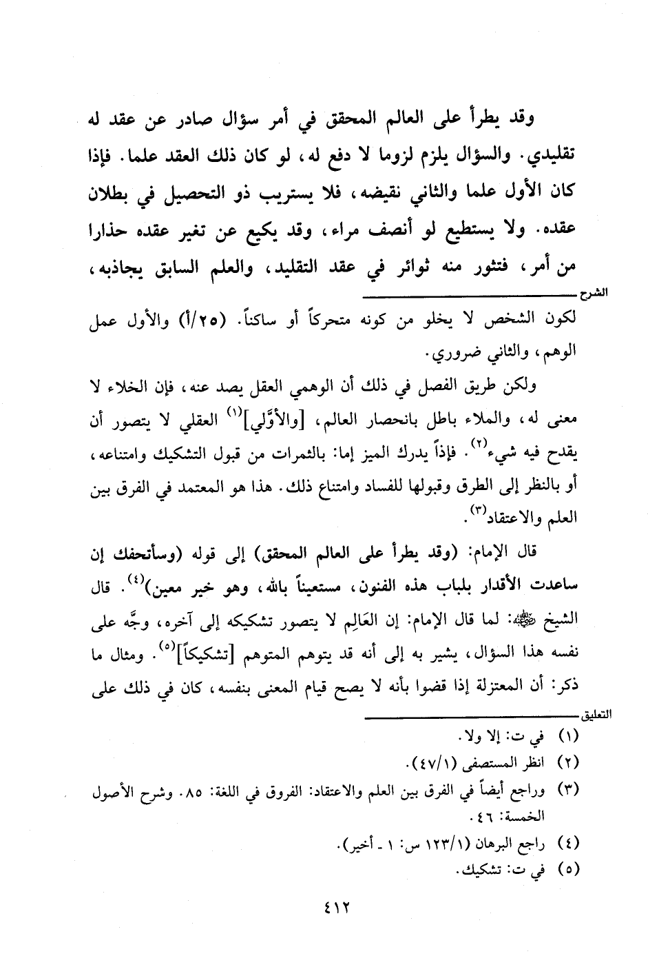 قال الإمام: (وقد يطرأ على العالم المحقق) إلى قوله (وسأتحفك إن ساعدت الأقدار بلباب هذه الفنون، مستعينا بالله، وهو خير معين). قال الشيخ - رضي الله عنه -: لما قال الإمام: إن العالم لا يتصور تشكيكه إلى آخره، وجه على نفسه هذا السؤال، يشير به إلى أنه قد يتوهم المتوهم [تشكيكا]. ومثال ما ذكر: أن المعتزلة إذا قضوا بأنه لا يصح قيام المعنى بنفسه، كان في ذلك على