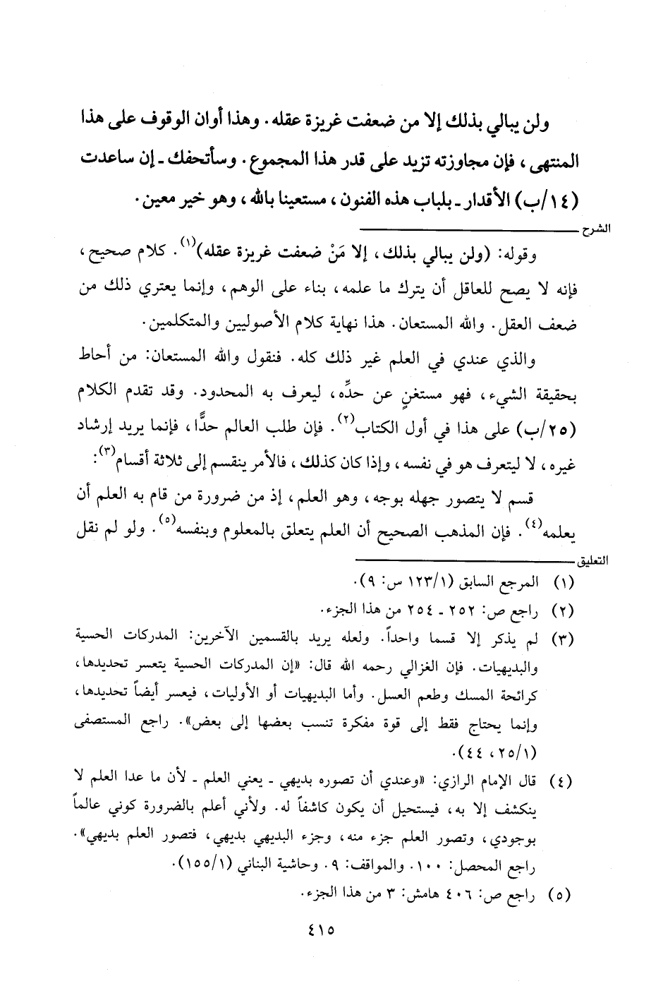وقوله: (ولن يبالي بذلك، إلا من ضعفت غريزة عقله). كلام صحيح، فإنه لا يصح للعاقل أن يترك ما علمه، بناء على الوهم، وإنما يعتري ذلك من ضعف العقل. والله المستعان. هذا نهاية كلام الأصوليين والمتكلمين.