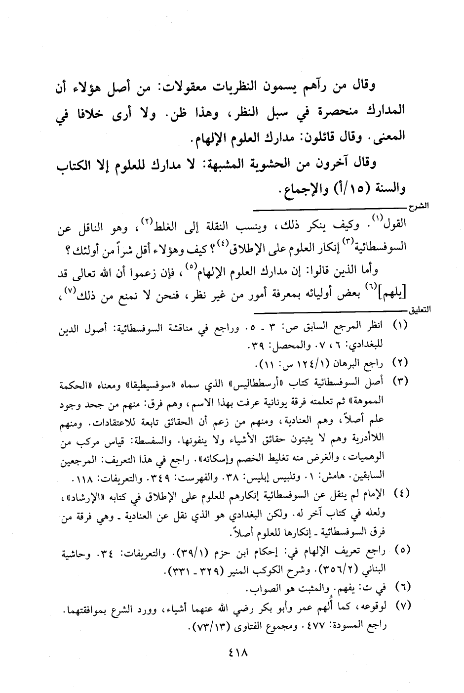 وأما الذين قالوا: إن مدارك العلوم الإلهام، فإن زعموا أن الله تعالى قد [يلهم] بعض أوليائه بمعرفة أمور من غير نظر، فنحن لا نمنع من ذلك،