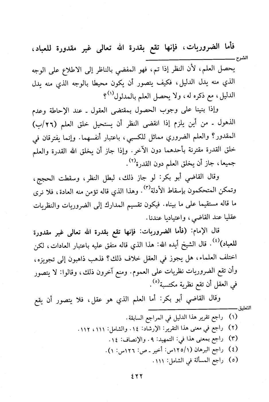 قال الإمام: (فأما الضروريات: فإنها تقع بقدرة الله تعالى غير مقدورة للعباد). قال الشيخ أيده الله: هذا الذي قاله متفق عليه باعتبار العادات، لكن اختلف العلماء، هل يجوز في العقل خلاف ذلك؟ فذهب ذاهبون إلى تجويزه، وأن تقع الضروريات نظريات على العموم. ومنع آخرون ذلك، وقالوا: لا يتصور في العقل أن تقع نظرية مكتسبة.