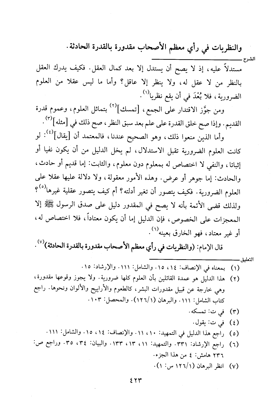 قال الإمام: (والنظريات في رأي معظم الأصحاب مقدورة بالقدرة الحادثة).