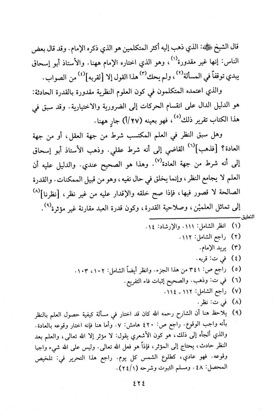 والذي اعتمده المتكلمون في كون العلوم النظرية مقدورة بالقدرة الحادثة: هو الدليل الدال على انقسام الحركات إلى الضرورية والاختيارية. وقد سبق في هذا الكتاب تقرير ذلك، فهو بعينه (٢٧/أ) جار ههنا.