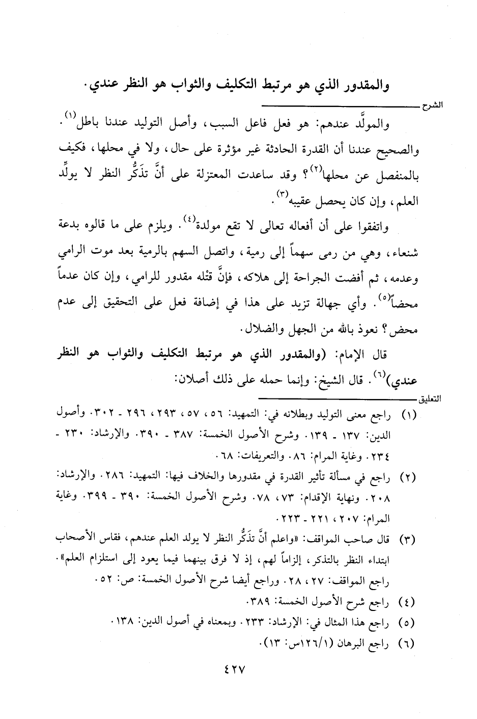 قال الإمام: (والمقدور الذي هو مرتبط التكليف والثواب هو النظر عندي). قال الشيخ: وإنما حمله على ذلك أصلان: