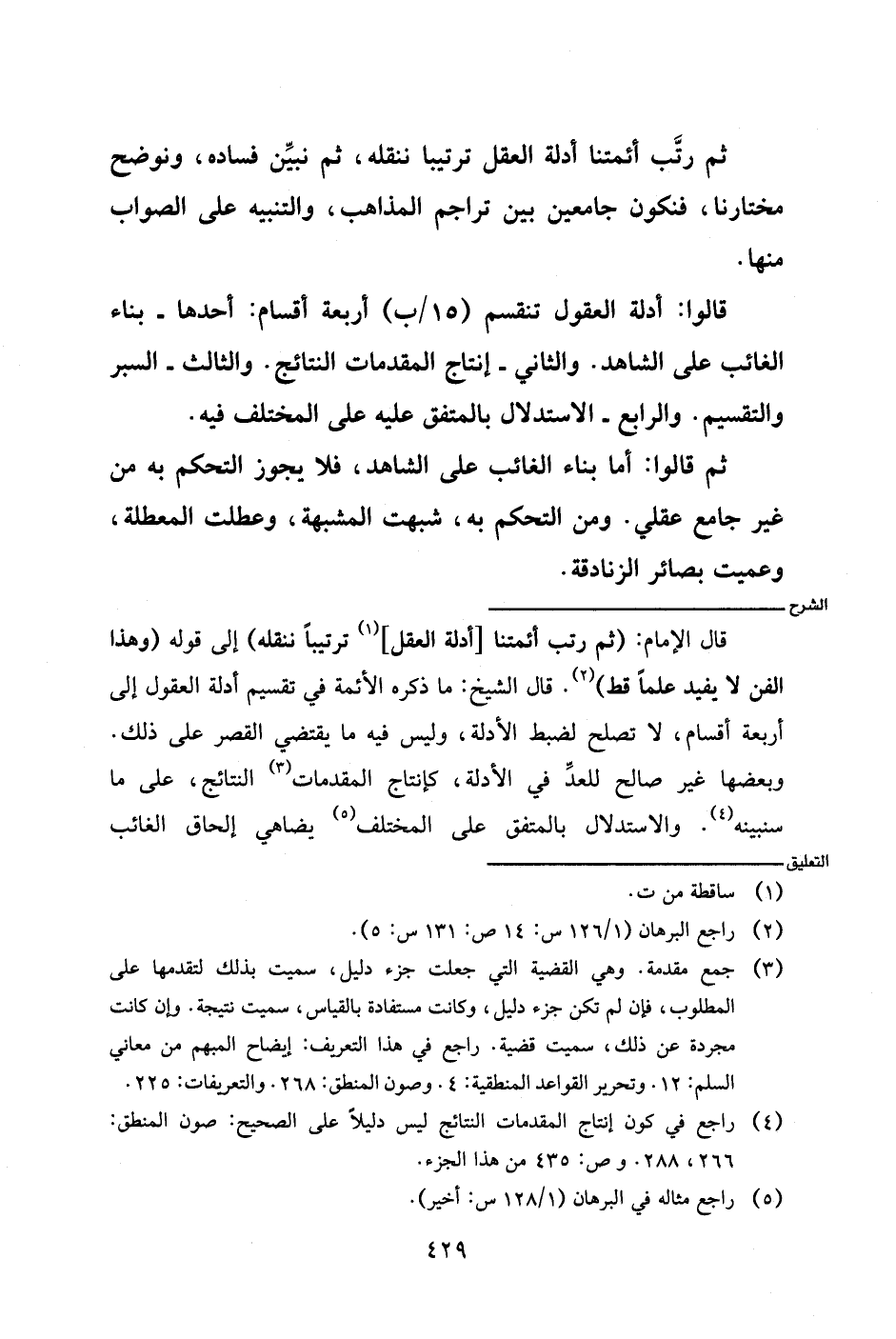 قال الإمام: (ثم رتب أئمتنا [أدلة العقل] ترتيبا ننقله) إلى قوله (وهذا الفن لا يفيد علما قط). قال الشيخ: ما ذكره الأئمة في تقسيم أدلة العقول إلى أربعة أقسام، لا تصلح لضبط الأدلة، وليس فيه ما يقتضي القصر على ذلك.