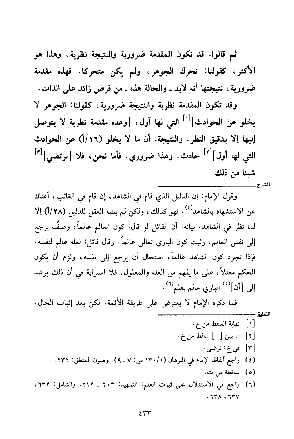 وقول الإمام: إن الدليل الذي قام في الشاهد، إن قام في الغائب، أغناك عن الاستشهاد بالشاهد. فهو كذلك، ولكن لم ينتبه العقل للدليل (٢٨/أ) إلا لما نظر في الشاهد. بيانه: أن القائل لو قال: كون العالم عالما، وصف يرجع إلى نفس العالم، وثبت كون الباري تعالى عالما. وقال قائل: لعله عالم لنفسه. فإذا تجرد كون الشاهد عالما، استحال أن يرجع إلى نفسه، ولزم أن يكون الحكم معللا، على ما يفهم من العلة والمعلول، فلا استرابة في أن ذلك يرشد إلى [أن] الباري عالم بعلم.