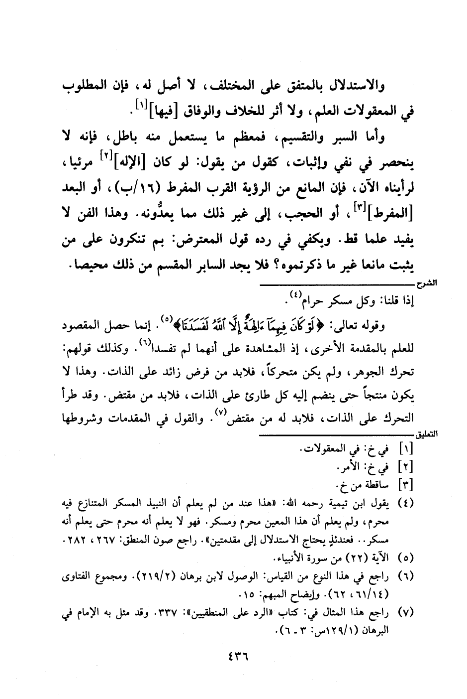 وقوله تعالى: {لو كان فيهما آلهة إلا الله لفسدتا}. إنما حصل المقصود للعلم بالمقدمة الأخرى، إذ المشاهدة على أنهما لم تفسدا. وكذلك قولهم: تحرك الجوهر، ولم يكن متحركا، فلابد من فرض زائد الذات. وهذا لا يكون منتجا حتى ينضم إليه كل طارئ على الذات، فلابد من مقتض. وقد طرأ التحرك على الذات، فلابد له من مقتض. والقول في المقدمات وشروطها