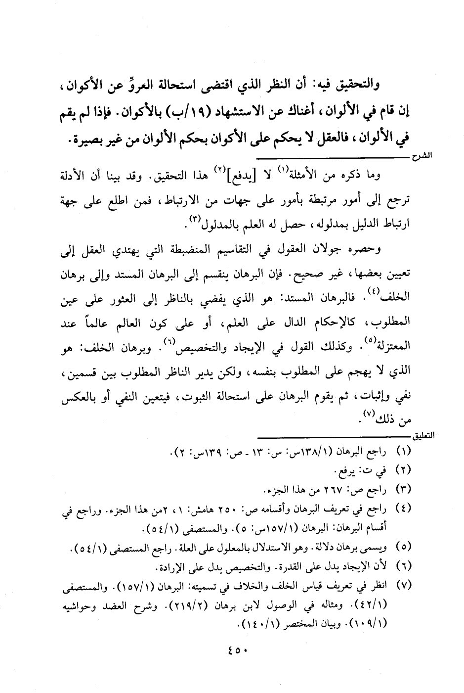وحصره جولان العقول في التقسيم المنضبطة التي يهتدي العقل إلى تعيين بعضها، غير صحيح. فإن البرهان ينقسم إلى البرهان المستد وإلى برهان الخلف. فالبرهان المستد: هو الذي يفضي بالناظر إلى العثور على عين المطلوب، كالإحكام الدال على العلم، أو على كون العالم عالما عند المعتزلة. وكذلك القول في الإيجاد والتخصيص. وبرهان الخلف: هو الذي لا يهجم على المطلوب بنفسه، ولكن يريد الناظر المطلوب بين قسمين، نفي وإثبات، ثم يقوم البرهان على استحالة الثبوت، فيتعين النفي أو بالعكس من ذلك.