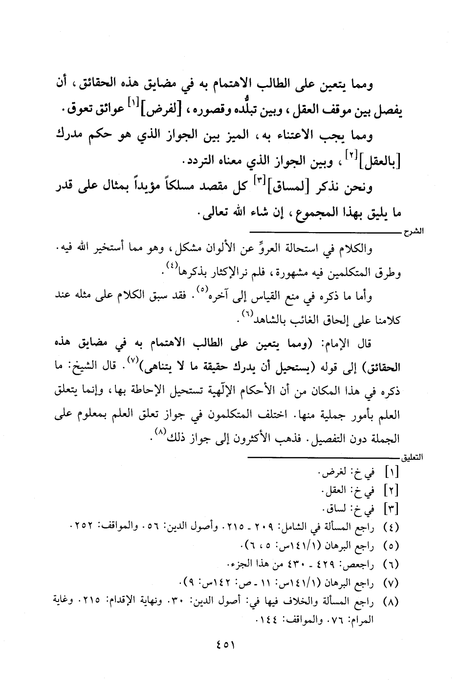 قال الإمام: (ومما يتعين على الطالب الاهتمام به في مضايق هذه الحقائق) إلى قوله (يستحيل أن يدرك حقيقة ما لا يتناهى). قال الشيخ: ما ذكره في هذا المكان من أن الأحكام الإلهية تستحيل الإحاطة بها، وإنما يتعلق العلم بأمور جميلة منها. اختلف المتكلمون في جواز تعلق العلم بمعلوم على الجملة دون التفصيل. فذهب الأكثرون إلى جواز ذلك.