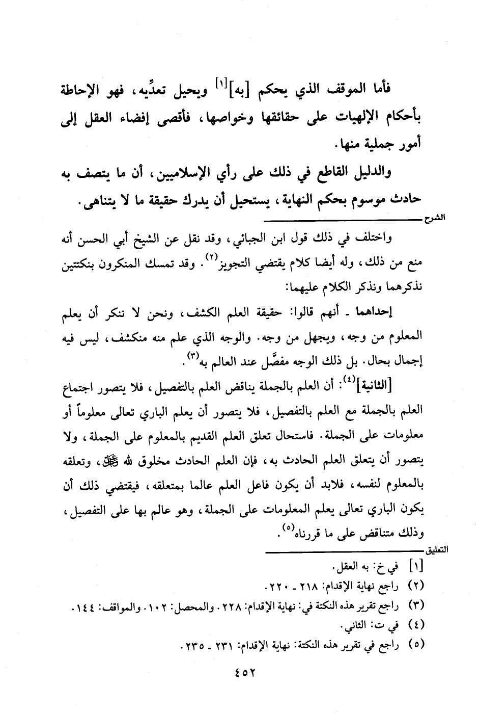 [الثانية]: أن العلم بالجملة يناقض العلم بالتفصيل، فلا يتصور اجتماع العلم بالجملة مع العلم بالتفصيل، فلا يتصور أن يعلم الباري تعالى معلوما أو معلومات على الجملة. فاستحال تعلق العلم على الجملة، ولا يتصور أن يتعلق العلم الحادث به، فإن العلم الحادث مخلوق لله - عز وجل -، وتعلقه بالمعلوم لنفسه، فلابد أن يكون فاعل العلم عالما بمتعلقه، فيقتضي ذلك أن يكون الباري تعالى يعلم المعلومات على الجملة، وهو عالم بها على التفصيل، وذلك متناقض على ما قررناه.