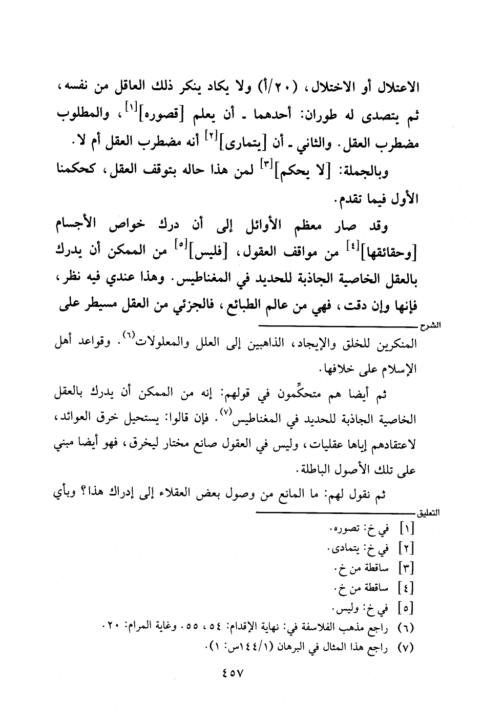 ثم أيضا هم متحكمون في قولهم: إنه من الممكن أن يدرك بالعقل الخاصية الجاذبة للحديد في المغناطيس. فإن قالوا: يستحيل خرق العوائد، لاعتقادهم إياها عقليات، وليس في العقول صانع مختار ليخرق، فهو أيضا مبني على تلك الأصول الباطلة.
