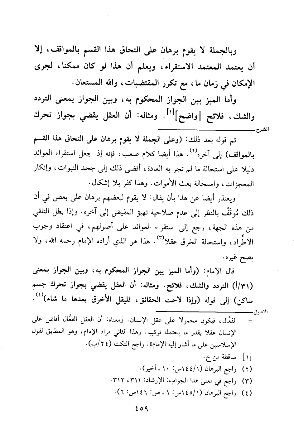 ثم قوله بعد ذلك: (وعلى الجملة لا يقوم برهان على التحاق هذا القسم بالمواقف) إلى آخره. هذا أيضا كلام صعب، فإنه إذا جعل استقراء العوائد دليلا على استحالة ما لم تجر به العادة، أفضى ذلك إلى جحد النبوات، وإنكار المعجزات، واستحالة بعث الأموات. وهذا كفر بلا إشكال.