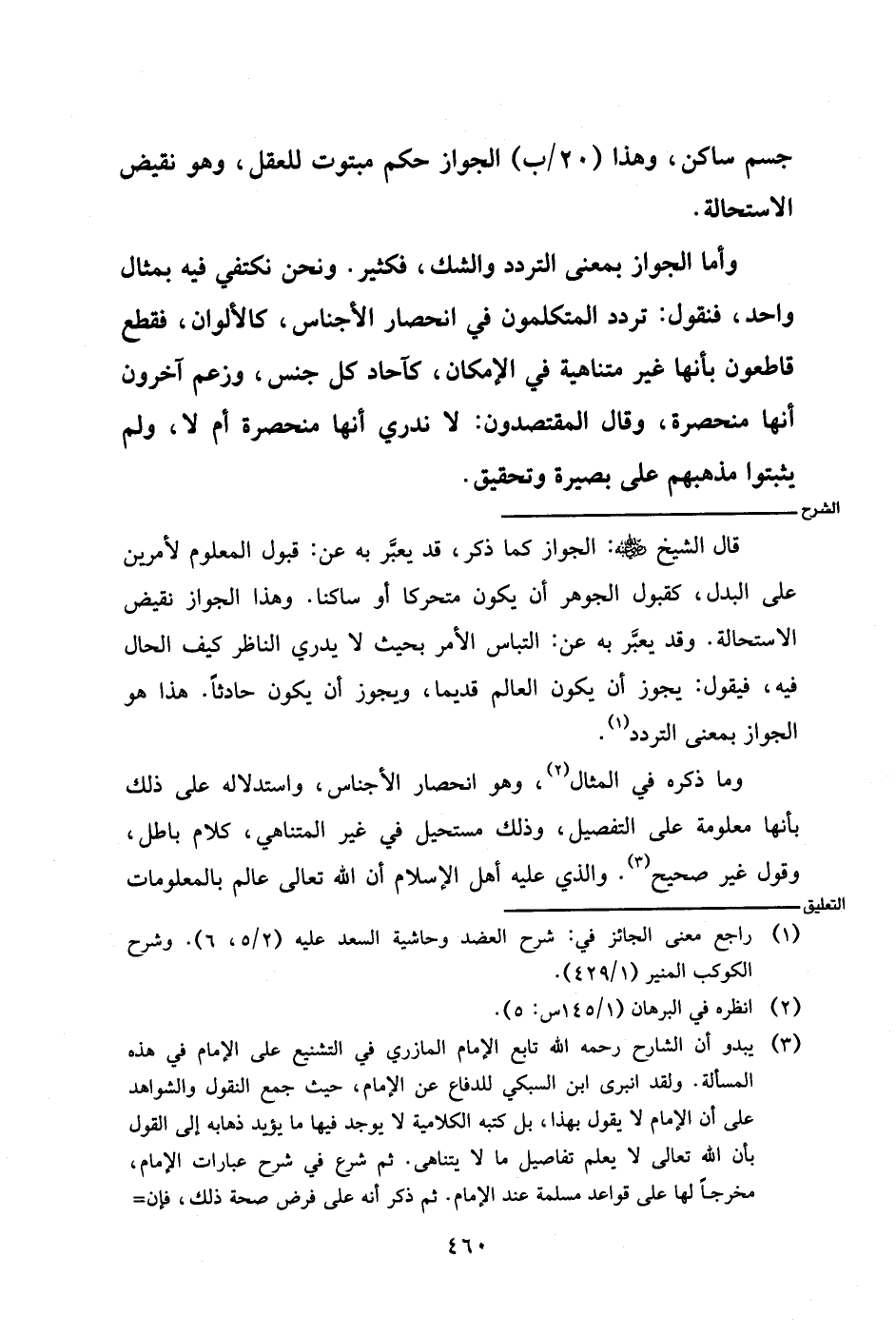 قال الشيخ - رضي الله عنه -: الجواز كما ذكر، قد يعبر به عن: قبول المعلوم لأمري على البدل، كقبول الجوهر أن يكن متحركا أو ساكنا. وهذا الجواز نقيض الاستحالة. وقد يعبر به عن: التباس المر بحيث لا يدري الناظر كيف الحال فيه، فيقول: يجوز أن يكون العالم قديما، ويجوز أن يكون حادثا. هذا هو الجواز بمعنى التردد.