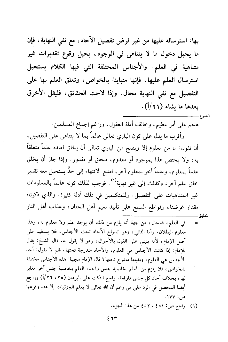 وأقرب ما يدل على كون الباري تعالى عالما بما لا يتناهى على التفصيل، أن نقول: ما من معلوم إلا ويصح من الباري تعالى أن يخلق لعبده علما متعلقا به، ولا يختص هذا بموجود أو معدوم، محقق أو مقدور. وإذا جاز أن يخلق علما بمعلوم، وعلما آخر بمعلوم آخر، امتنع الانتهاء إلى حد يستحيل معه تقدير خلق علم آخر، وكذلك إلى غير نهاية. فوجب لذلك كونه عالما بالمعلومات غير المتناهية على التفصيل. وللمتكلمين في ذلك أدلة كثيرة. والذي ذكرناه مقدار غرضنا، وقواطع السمع على تأبيد نعيم أهل الجنان، وعذاب أهل النار
