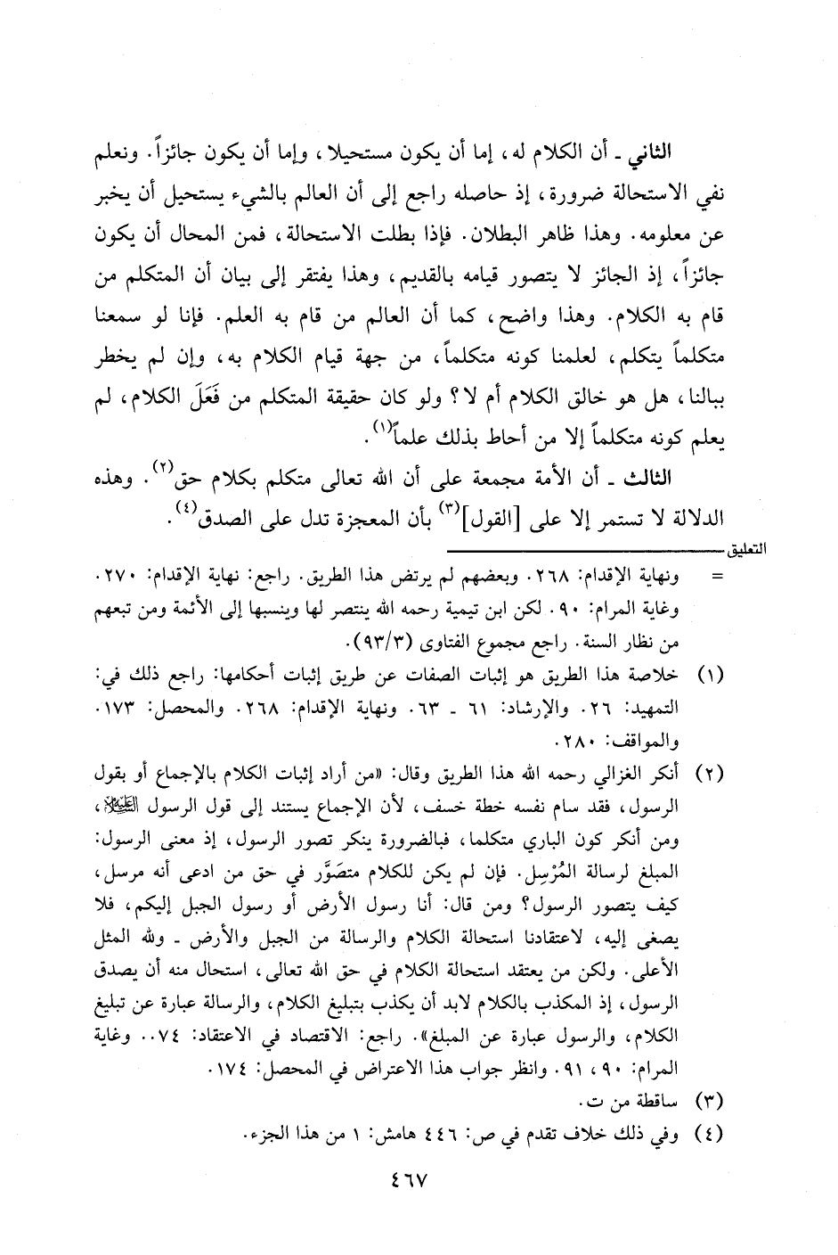 الثالث- أن الأمة مجمعة على أن الله تعالى متكلم بكلام حق. وهذه الدلالة لا تستمر إلا على [القول] بأن المعجزة تدل على الصدق.