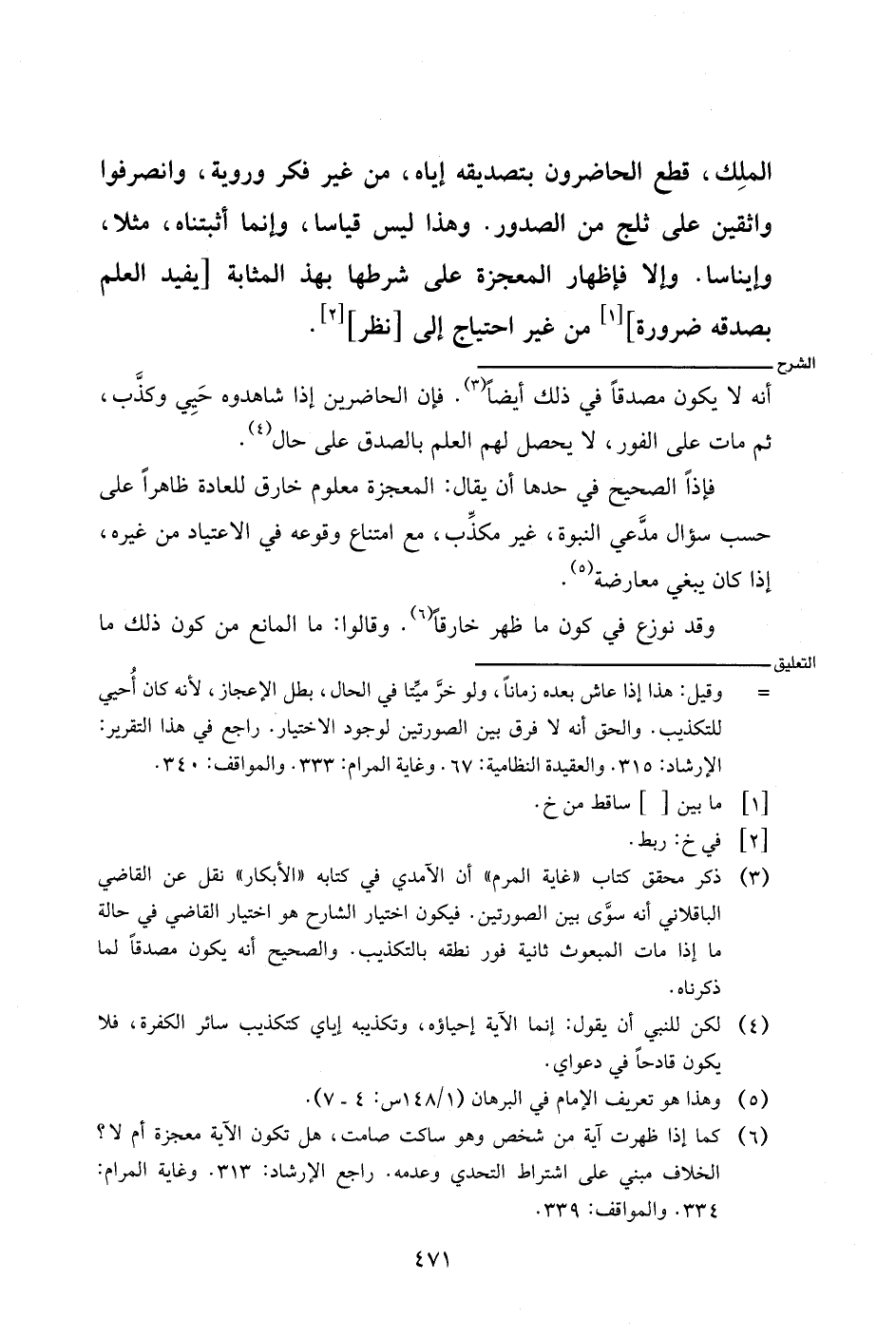 فإذا الصحيح في حدها أن يقال: المعجزة معلوم خارق للعادة ظاهرا على حسب سؤال مدعي النبوة، غير مكذب، مع امتناع وقوعه في الاعتياد من غيره، إذا كان يبغي معارضة.