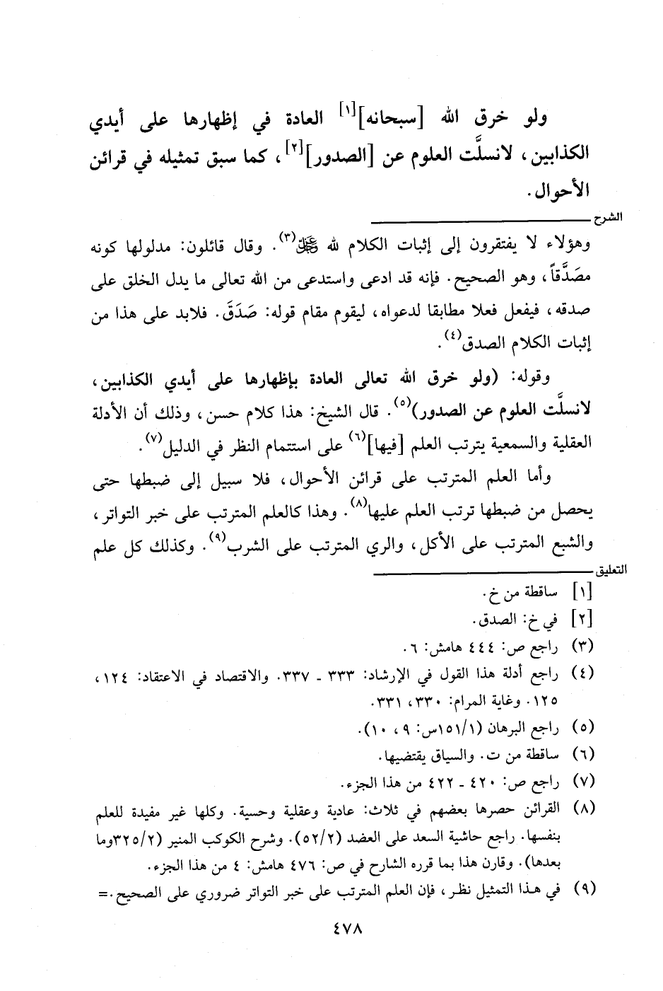 وقوله: (ولو خرق الله تعالى العادة بإظهارها على أيدي الكذابين، لانسلت العلوم عن الصدور). قال الشيخ: هذا كلام حسن، وذلك أن الأدلة العقلية والسمعية يترتب العلم [فيها] على استتمام النظر في الدليل.