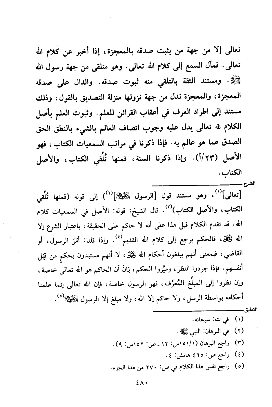 [تعالى]، وهو مستند قول [الرسول - عليه السلام -]) إلى قوله (فمنها تلقي الكتاب، والأصل الكتاب). قال الشيخ: قوله: الأصل في السمعيات كلام الله. قد تقدم الكلام قبل هذا على أنه لا حاكم على الحقيقة، باعتبار الشرع إلا الله - عز وجل - فالحكم يرجع إلى كلام الله القديم. وإذا قلنا: أمر الرسول، أو القاضي، فبمعنى أنهم يبلغون أحكام الله - عز وجل -، لا أنهم مستبدون بحكم من قبل أنفسهم. فإذا جردوا النظر، وميزوا الحكم، بان أن الحاكم هو الله تعالى خاصة، وإن نظروا إلى المبلغ المعرف، فهو الرسول خاصة، فإن الله تعالى إنما علمنا أحكامه بواسطة الرسل، ولا حاكم إلا الله، ولا مبلغ إلا الرسول - عليه السلام -.