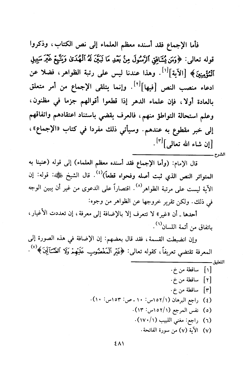 قال الإمام: (وأما الإجماع فقد أسنده معظم العلماء) إلى قوله (عنينا به المتواتر النص الذي ثبت أصله وفحواه قطعا). قال الشيخ - رضي الله عنه -: قوله: إن الآية ليست على مرتبة الظواهر. اقتصارا على الدعوى من غير أن يبين الوجه في ذلك. ولكن تقرير خروجها عن الظواهر من وجوه: