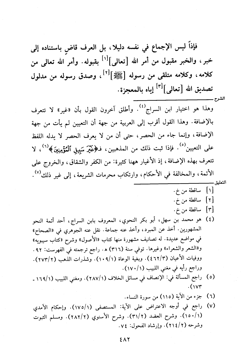 وهذا هو اختيار ابن السراج. وأطلق آخرون القول بأن (غير) لا تتعرف بالإضافة. وهذا القول أقرب إلى العربية من جهة أن التعيين لم يأت من جهة الإضافة، وإنما جاء من الحصر، حتى أن من لا يعرف الحصر لا يدله اللفظ على التعيين. فإذا ثبت ذلك من المذهبين، فـ {غير سبيل المؤمنين}، لا تتعرف بهذه الإضافة، إذ الأغيار هاهنا كثيرة: من الكفر والشقاق، والخروج على الأئمة، والمخالفة في الأحكام، وارتكاب محرمات الشريعة، إلى غير ذلك.