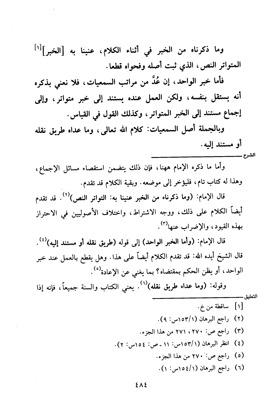 قال الإمام: (وما ذكرناه من الخبر عنينا به: التواتر النص). قد تقدم أيضا الكلام على ذلك، ووجه الاشتراط، واختلاف الأصوليين في الاحتراز بهذه القيود، والإضراب عنها.