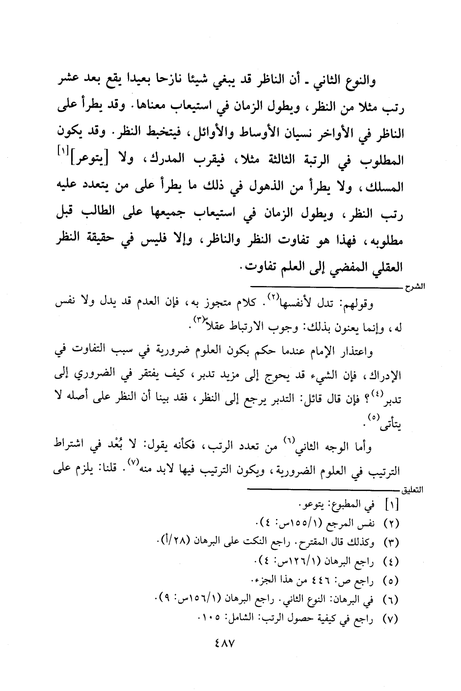 وأما الوجه الثاني من تعدد الرتب، بكأنه يقول: لا بعد في اشتراط الترتيب في العلوم الضرورية، ويكون الترتيب فيها لابد منه. قلنا: يلزم على