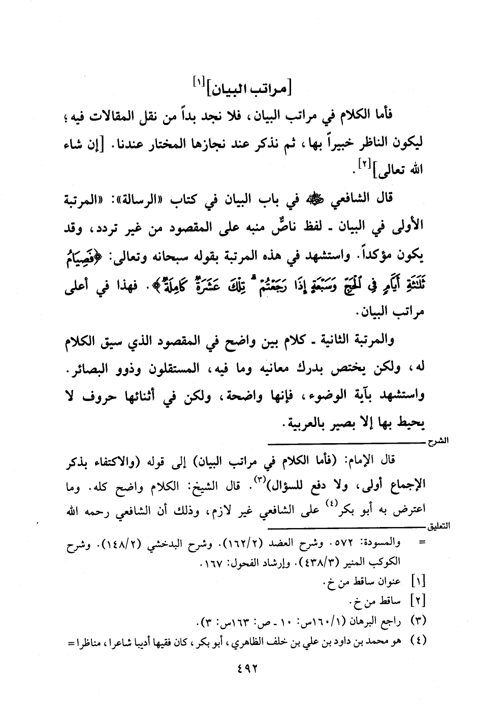 قال الإمام: (فأما الكلام في مراتب البيان) إلى قوله (والاكتفاء بذكر الإجماع أولى، ولا دفع للسؤال). قال الشيخ: الكلام واضح كله. وما اعترض به أبو بكر على الشافعي غير لازم، وذلك أن الشافعي رحمه الله