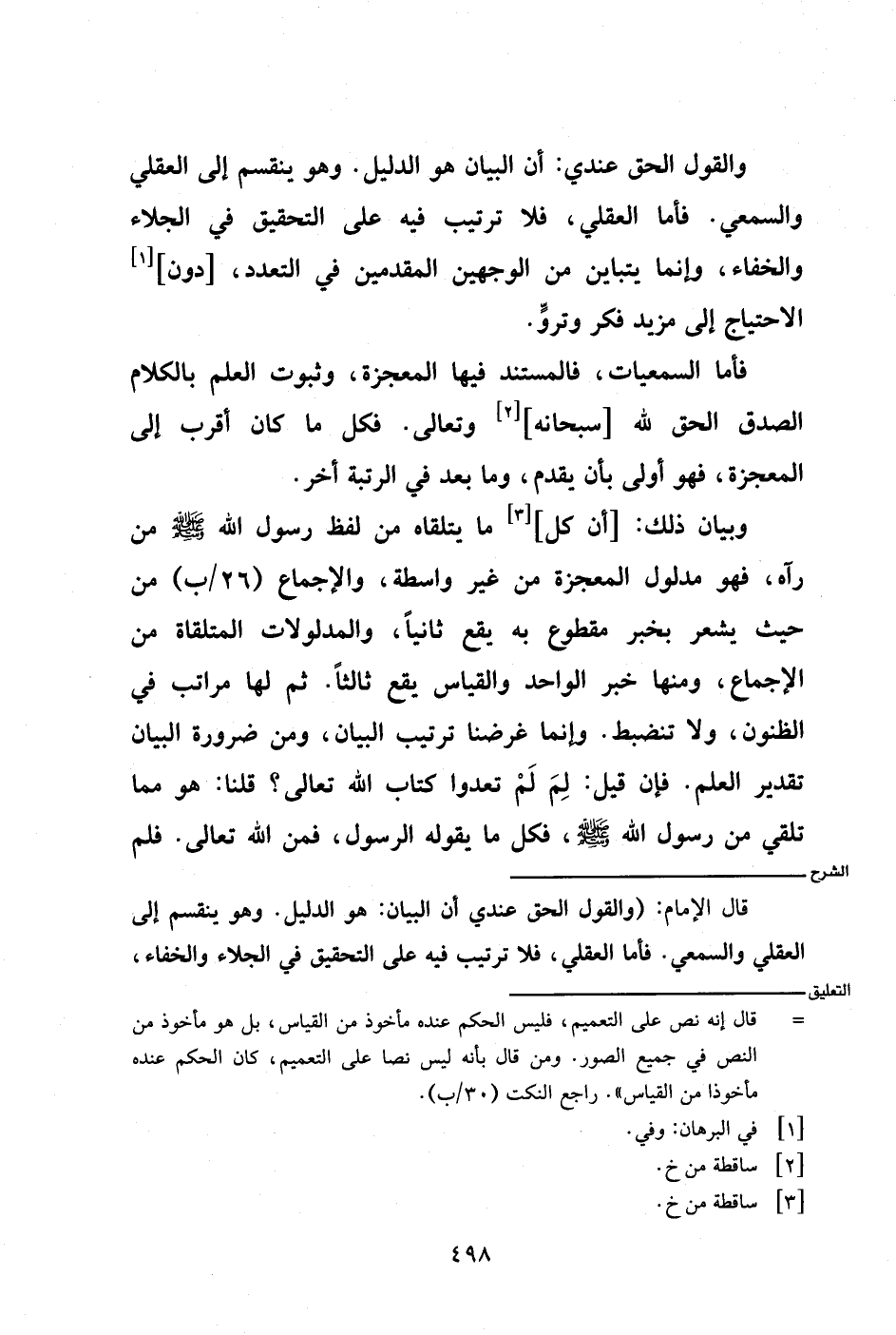 قال الإمام: (والقول الحق عندي أن البيان: هو الدليل. وهو ينقسم إلى العقلي والسمعي. فأما العقلي، فلا ترتيب فيه على التحقيق في الجلاء والخفاء،