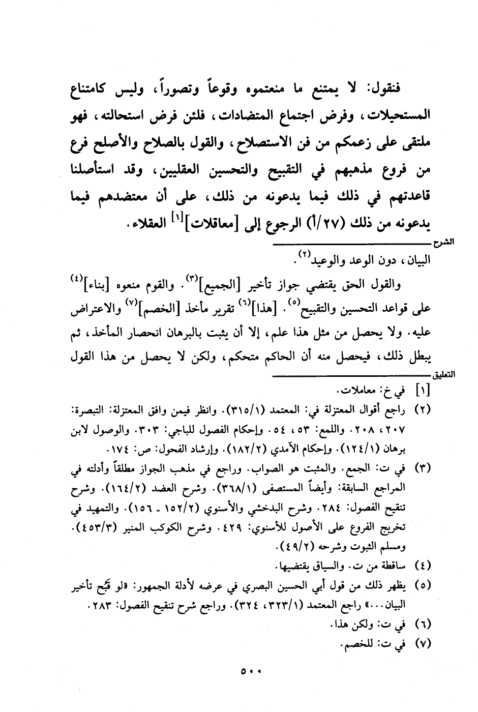 والقول الحق يقتضي جواز تأخير [الجميع]. والقوم منعوه [بناء] على قواعد التحسين والتقبيح. [هذا] تقرير مأخذ [الخصم] والاعتراض عليه. ولا يحصل من مثل هذا علم، إلا أن يثبت بالبرهان انحصار المأخذ، ثم يبطل ذلك، فيحصل منه أن الحاكم متحكم، ولكن لا يحصل من هذا القول