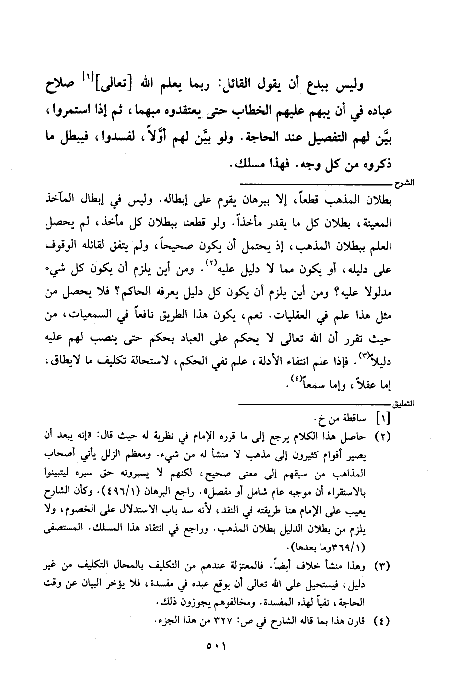 بطلان المذهب قطعا، إلا ببرهان يقوم على إبطاله. وليس في إبطال المآخذ المعينة، بطلان كل ما يقدر مأخذا. ولو قطعنا ببطلان كل مأخذ، لم يحصل العلم ببطلان المذهب، إذ يحتمل أن يكون صحيحا، ولم يتفق لقائله الوقوف على دليله، أو يكون مما لا دليل عليه. ومن أين يلزم أن يكون كل شيء مدلولا عليه؟ ومن أين يلزم أن يكون كل دليل يعرفه الحاكم؟ فلا يحصل من مثل هذا علم في العقليات. نعم، يكون هذا الطريق نافعا في السمعيات، من حيث تقرر أن الله تعالى لا يحكم على العباد بحكم حتى ينصب لهم عليه دليلا. فإذا علم انتفاء الأدلة، علم نفي الحكم، لاستحالة تكليف ما لا يطاق، إما عقلا، وإما سمعا.