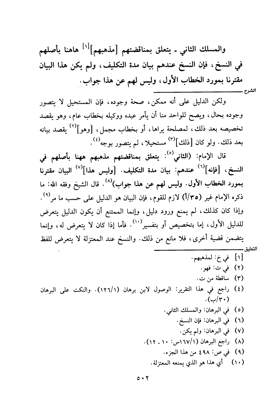 قال الإمام: (الثاني: يتعلق بمناقضتهم مذهبهم هاهنا بأصلهم في النسخ، [فإنه] عندهم: بيان مدة التكليف. [وليس هذا] البيان مقترنا بمورد الخطاب الأول. وليس لهم عن هذا جواب). قال الشيخ وفقه الله: ما ذكره الإمام غير (٣٥/أ) لازم للقوم، فإن البيان هو الدليل على حسب ما مر. وإذا كان كذلك، لم يمنع ورود دليل، وإنما الممتنع أن يكون الدليل يتعرض للدليل الأول، إما بتخصيص أو تفسير. فأما إذا كان لا يتعرض له، وإنما يتضمن قضية أخرى، فلا مانع من ذلك. والنسخ عند المعتزلة لا يتعرض للفظ