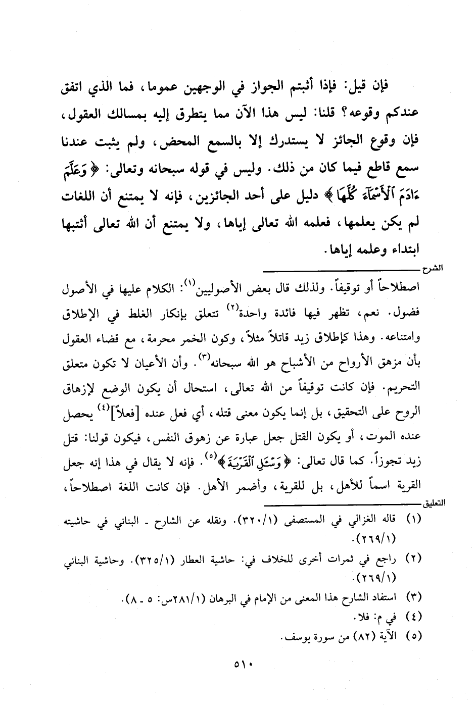 اصطلاحا أو توقيفا. ولذلك قال بعض الأصوليين: الكلام عليها في الإطلاق وامتناعه. وهذا كإطلاق زيد قاتلا مثلا، وكون الخمر محرمة، مع قضاء العقول بأن مزهق الأرواح من الأشباح هو الله سبحانه. وأن الأعياد لا تكون متعلق التحريم. فإن كانت توقيفا من الله تعالى، استحال أن يكون الوضع لإزهاق الروح على التحقيق، بل إنما يكون معنى قتله، أي فعل عنده [فعلا] يحصل عنده الموت، أو يكون القتل عبارة عن زهوق النفس، فيكون قولنا: قتل زيد تجوزا. كما قال تعالى: {وسئل القرية}. فإنه لا يقال في هذا إنه جعل القرية اسما للأهل، بل للقرية، وأضمر الأهل. فإن كانت اللغة اصطلاحا،