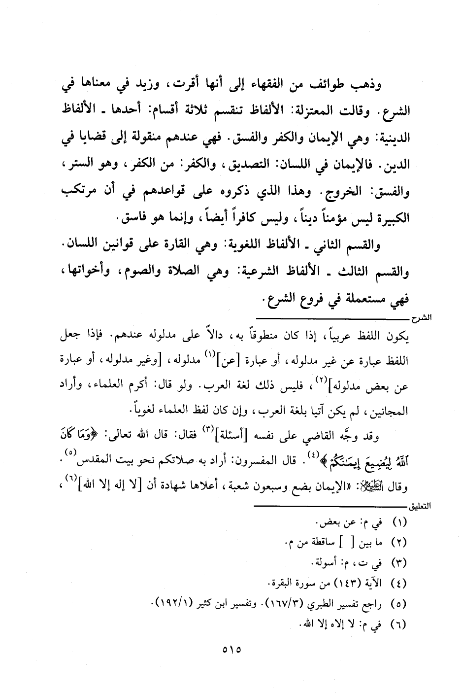 وقد وجه القاضي على نفسه [أسئلة] فقال: قال الله تعالى: {وما كان الله ليضيع إيمانكم}. قال المفسرون: أراد به صلاتكم نحو بيت المقدس. وقال - عليه السلام -: (الإيمان بضع وسبعون شعبة، أعلاها شهادة أن [لا إله إلا الله]،