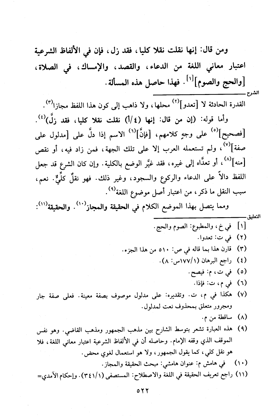 وأما قوله: (إن من قال: إنها (٤/أ) نقلت نقلا كليا، فقد زل). [فصحيح] على وجه كلامهم، [فإن] الاسم إذا دل على [مدلول على صفة]، ولم تستعمله العرب إلا على تلك الجهة، فمن زاد فيه، أو نقص [منه]، أو تعداه إلى غيره، فقد غير الوضع بالكلية. وإن كان الشرع قد جعل اللفظ دالا على الدعاء والركوع والسجود، وغير ذلك. فهو نقل كلي. نعم، سبب النقل ما ذكر، من اعتبار أصل موضوع اللغة.