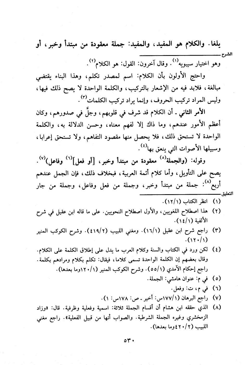 وقوله: (والجملة معقودة من مبتدأ وخبر، [أو فعل] وفاعل). يصح على التأويل، وأم كلام أئمة العربية، فبخلاف ذلك، فإن الجمل عندهم أربع: جملة من مبتدأ وخبر، وجمل من فعل وفاعل، وجملة من جار