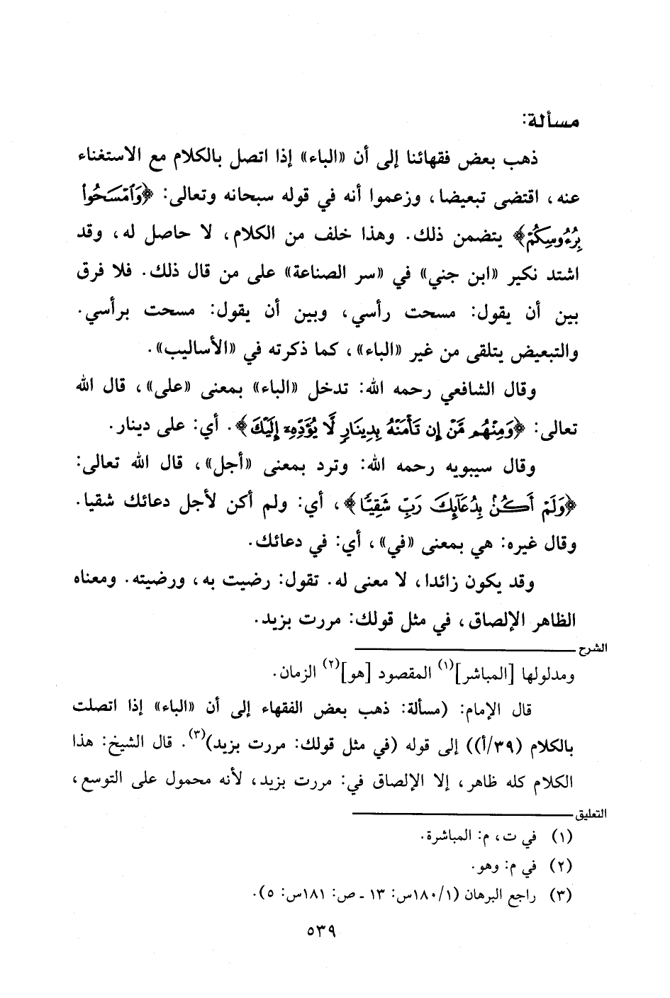 قال الإمام: (مسألة: ذهب بعض الفقهاء إلى أن (الباء) إذا اتصلت بالكلام (٣٩/أ) إلى قوله (في مثل قولك: مررت بزيد). قال الشيخ: هذا الكلام كله ظاهر، إلا الإلصاق في: مررت بزيد، لأنه محمول على التوسع،
