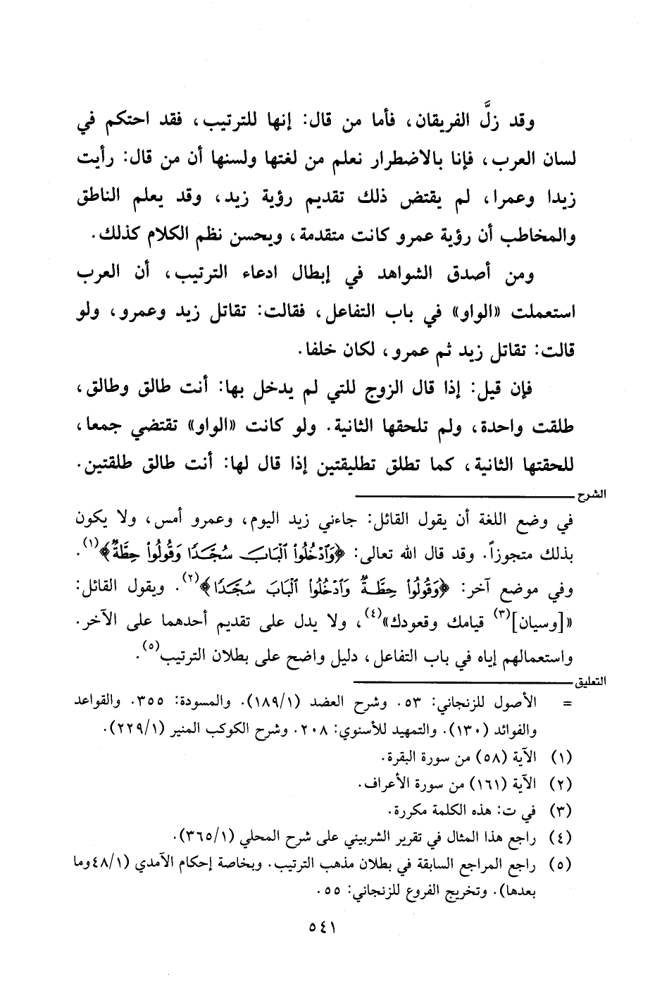 في وضع اللغة أن يقول القائل: جاءني زيد اليوم، وعمرو أمس، ولا يكون بذلك متجوزا. وقد قال الله تعالى: {وادخلوا الباب سجدا وقولوا حطة}. وفي موضع آخر: {وقولوا حطة وادخلوا الباب سجدا}. ويقول القائل: ([وسيان] قيامك وقعودك)، ولا يدل على تقديم أحدهما على الآخر. واستعمالهم إياه في باب التفاعل، دليل واضح على بطلان الترتيب.