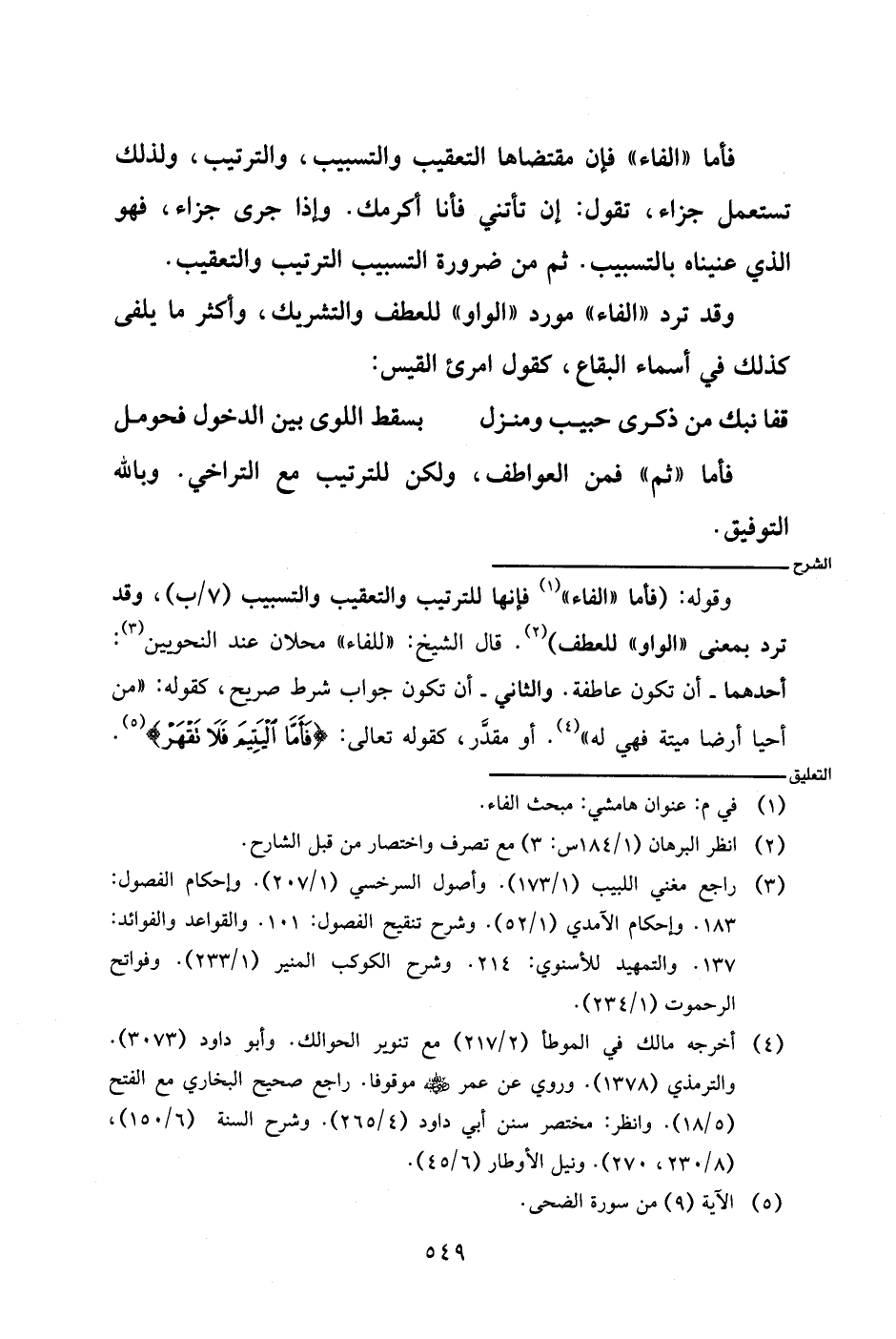 وقوله: (فأما (الفاء) فإنها للترتيب والتعقيب والتسبيب (٧/ب)، وقد ترد بمعنى (الواو) للعطف). قال الشيخ: (للفاء) محلان عند النحويين: أحدهما- أن تكون عاطفة. والثاني- أن تكون جواب شرط صريح، كقوله: (من أحيا أرضا ميتة فهي له). أو مقدر، كقوله تعالى: {فأما اليتيم فلا تقهر}.