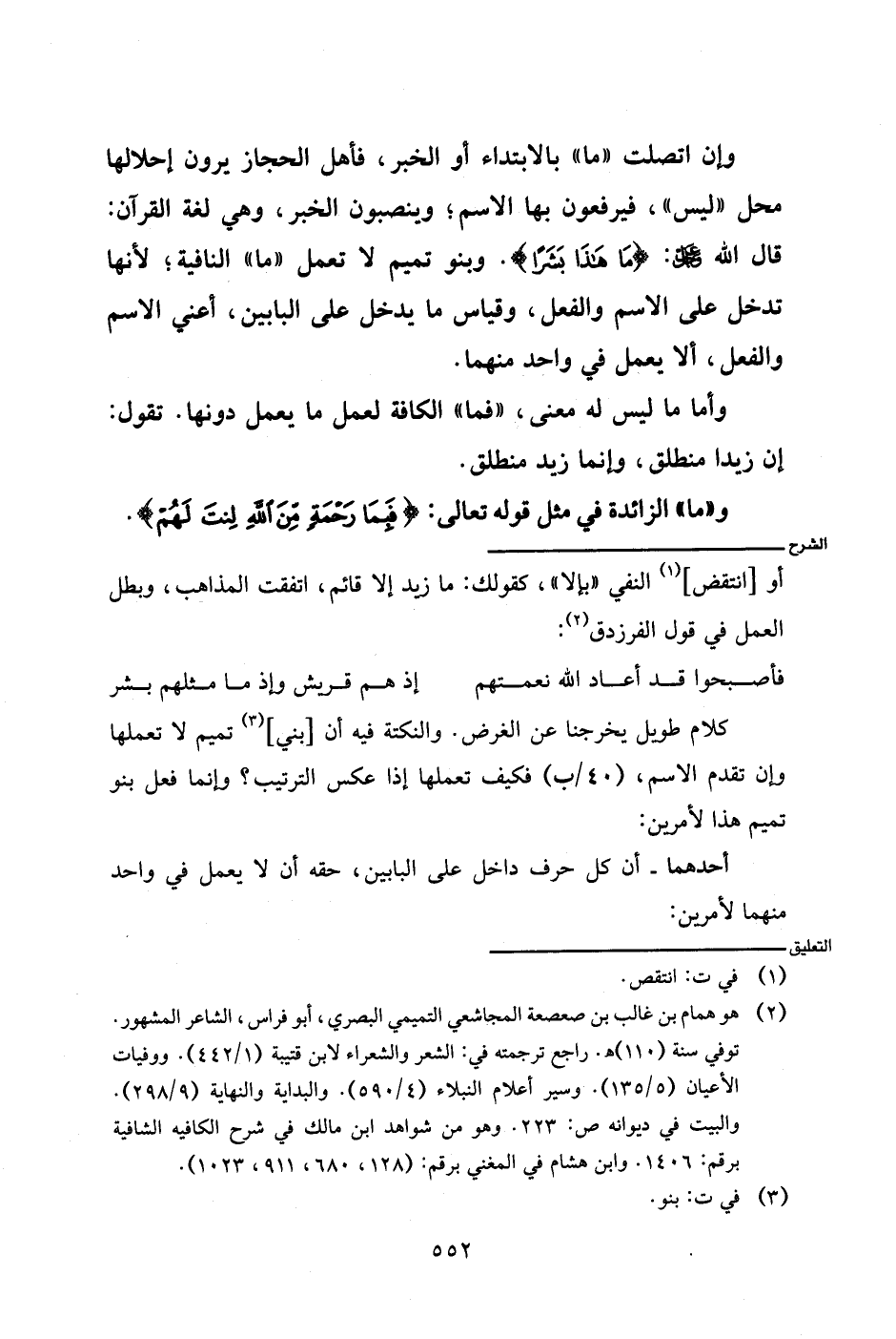 كلام طويل يخرجنا عن الغرض. والنكتة فيه أن [بني] تميم لا تعملها وإن تقدم الاسم، (٤٠/ب) فكيف تعملها إذا عكس الترتيب؟ وإنما فعل بنو تميم هذا لأمرين: