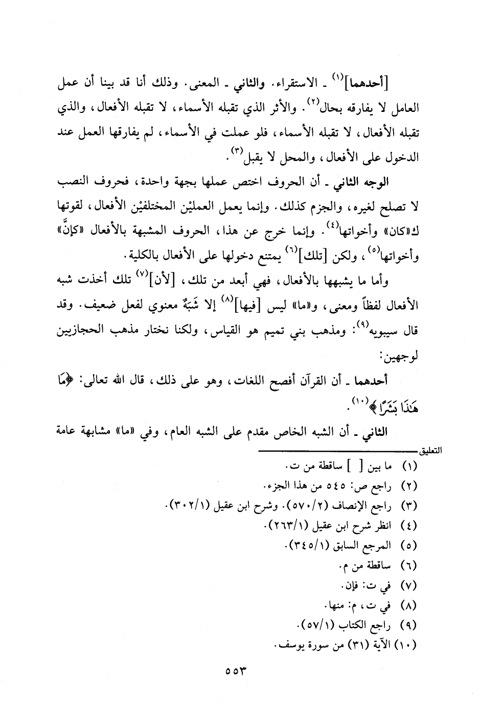 وأما ما يشبهها بالأفعال، فهي أبعد من تلك، [لأن] تلك أخذت شبه الأفعال لفظا ومعنى، و (ما) ليس [فيها] إلا شبه معنوي لفعل ضعيف. وقد قال سيبويه: ومذهب بني تميم هو القياس، ولكنا نختار مذهب الحجازيين لوجهين: