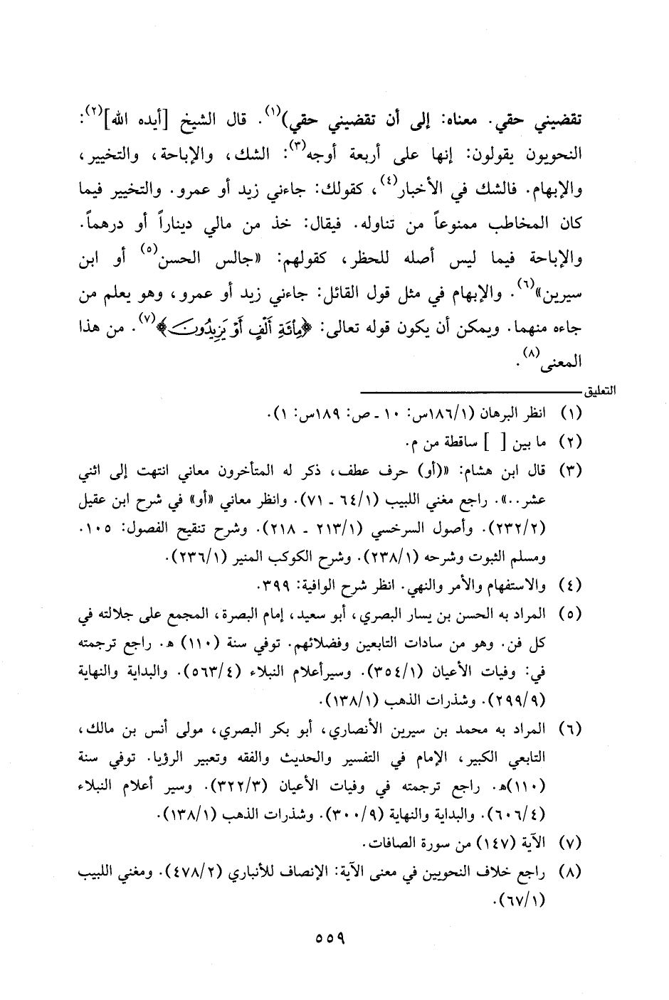 تقضيني حقي. معناه: إلى أن تقضيني حقي). قال الشيخ [أيده الله]: النحويون يقولون: إنها على أربعة أوجه: الشك، والإباحة، والتخيير، والإبهام. فالشك في الأخبار، كقولك: جاءني زيد أو عمرو. والتخيير فيما كان المخاطب ممنوعا من تناوله. فيقال: خذ من مالي دينارا أو درهما. والإباحة فيما ليس أصله للحظر، كقولهم: (جالس الحسن أو ابن سيرين). والإبهام في مثل قول القائل: جاءني زيد أو عمرو، وهو يعلم من جاءه منهما. ويمكن أن يكون قوله تعالى: {مائة ألف أو يزيدون}. من هذا المعنى.
