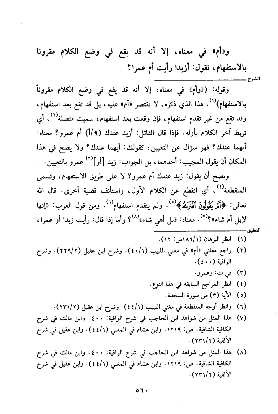 وقوله: ((وأم) في معناه، إلا أنه قد يقع في موضع الكلام مقرونا بالاستفهام). هذا الذي ذكره، لا تقتصر (أم) عليه، بل قد تقع بعد استفهام، وقد تقع من غير تقدم استفهام، فإن وقعت بع استفهام، سميت متصلة، أي تربط آخر الكلام بأوله. فإذا قال القائل: أزيد عندك (٩/أ) أم عمرو؟ معناه: أيهما عندك؟ فهو سؤال عن التعيين، كقولك: أيهما عندك؟ ولا يصح في هذا المكان أن يقول المجيب: أحدهما، بل الجواب: زيد [أو] عمرو بالتعيين.