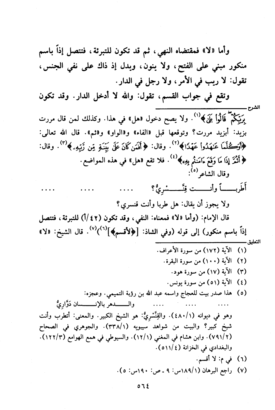 قال الإمام: (وأما (لا) فمعناه: النفي، وقد تكون (٤٢/أ) للتبرئة، فتتصل إذا باسم منكور) إلى قوله (وفي الشاذ: [{لأقسم}]. قال الشيخ: (لا)