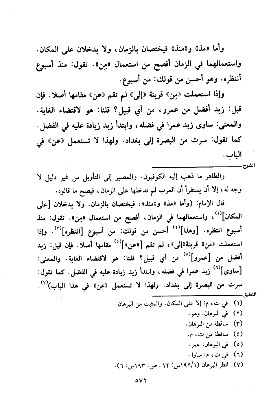 قال الإمام: (وأما (مذ) و (منذ)، فيختصان بالزمان. ولا يدخلان [على المكان]، واستعمالهما في الزمان، أفصح من استعمال (من). تقول: منذ أسبوع انتظره. [وهذا] أحسن من قولك: من أسبوع [انتظره]. وإذا استعملت (من) قرينة (إلى)، لم تقم [(عن)] مقامها أصلا. فإن قيل: زيد أفضل من [عمرو] من أي قبيل؟ هو لاقتضاء الغاية. والمعنى: [ساوى] زيد عمرا في فضله، وابتدأ زيد زيادة عليه في الفضل. كما تقول: سرت من البصرة إلى بغداد. ولهذا لا تستعمل (عن) في هذا الباب).