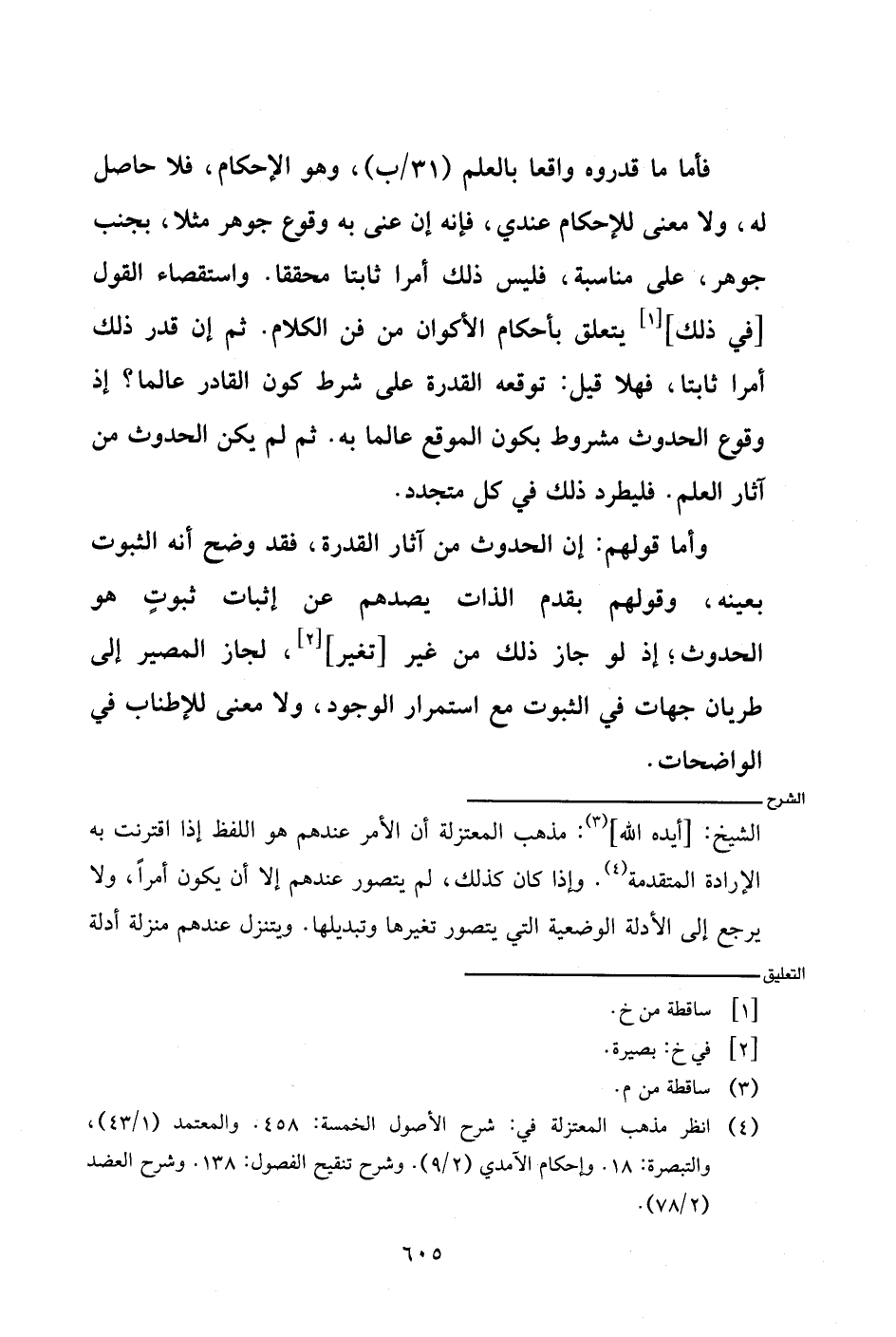 الشيخ: [أيده الله]: مذهب المعتزلة أن الأمر عندهم هو اللفظ إذا اقترنت به الإرادة المتقدمة. وإذا كان كذلك، لم يتصور عندهم إلا أن يكون أمرا، ولا يرجع إلى الأدلة الوضعية التي يتصور تغيرها وتبديلها. ويتنزل عندهم منزلة أدلة