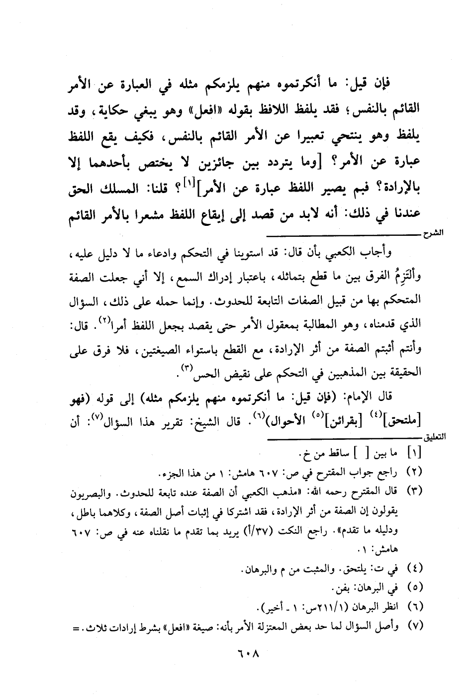 وأجاب الكعبي بأن قال: قد استوينا في التحكم وادعاء ما لا دليل عليه، وألتزم الفرق بين ما قطع بتماثل، باعتبار إدراك السمع، إلا أني جعلت الصفة المتحكم بها من قبيل الصفات التابعة للحدوث. وإنما حمله على ذلك، السؤال الذي قدمناه، وهو المطالبة بمعقول الأمر حتى يقصد بجعل اللفظ أمرا. قال: وأنتم أثبتم الصفة من أثر الإرادة، مع القطع باستواء الصيغتين، فلا فرق على الحقيقة بين المذهبين في التحكم على نقيض الحس.