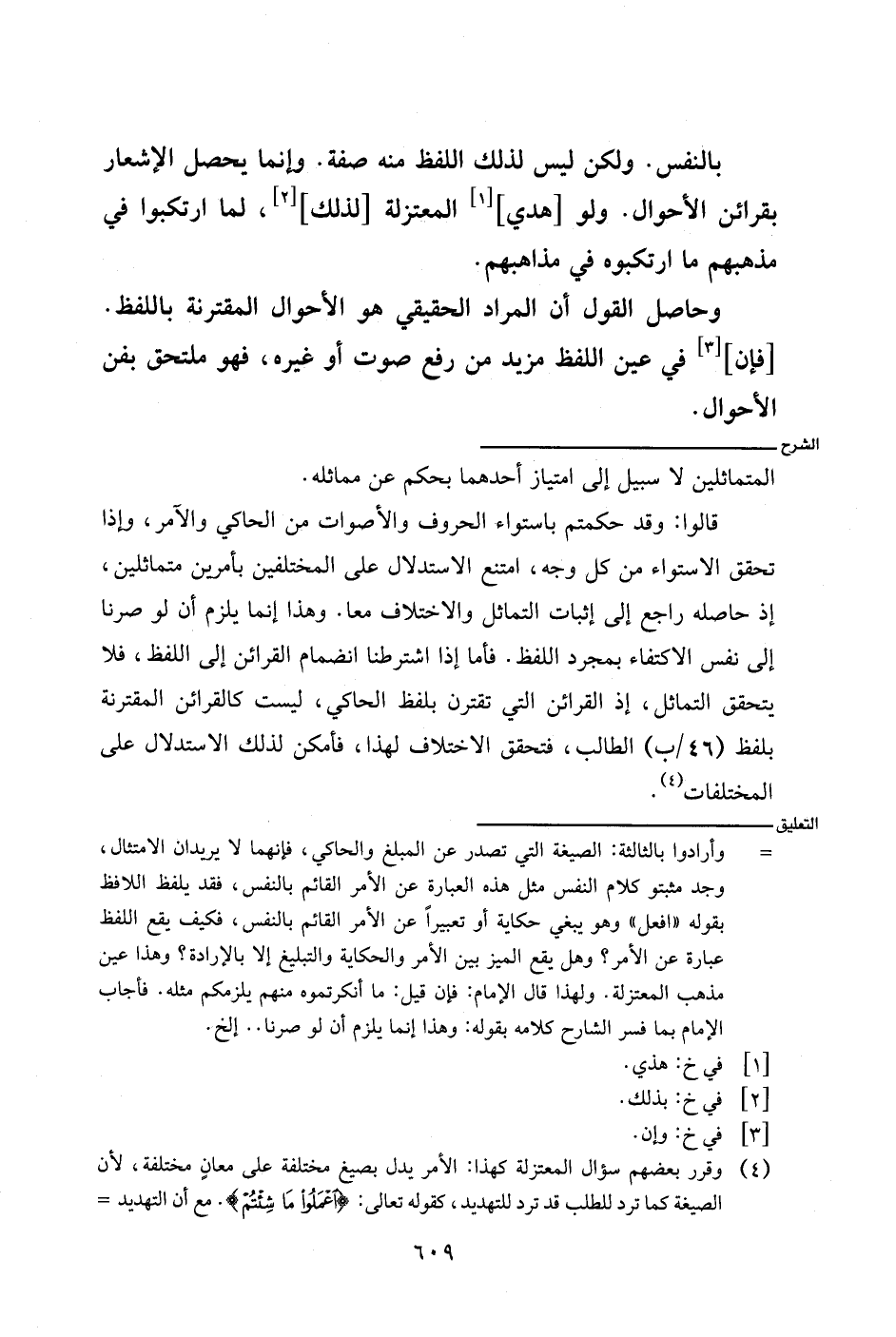 قالوا: وقد حكمتم باستواء الحروف والأصوات من الحاكي والآمر، وإذا تحقق الاستواء من كل وجه، امتنع الاستدلال على المختلفين بأمرين متماثلين، إذا حاصله راجع إلى إثبات التماثل والاختلاف معا. وهذا إنما يلزم أن لو صرنا إلى نفس الاكتفاء بمجرد اللفظ. فأما إذا اشترطنا انضمام القرائن إلى اللفظ، فلا يتحقق التماثل، إذا القرائن التي تقترن بلفظ الحاكي، ليست كالقرائن المقترنة بلفظ (٤٦/ب) الطالب، فتحقق الاختلاف لهذا، فأمكن لذلك الاستدلال على المختلفات.