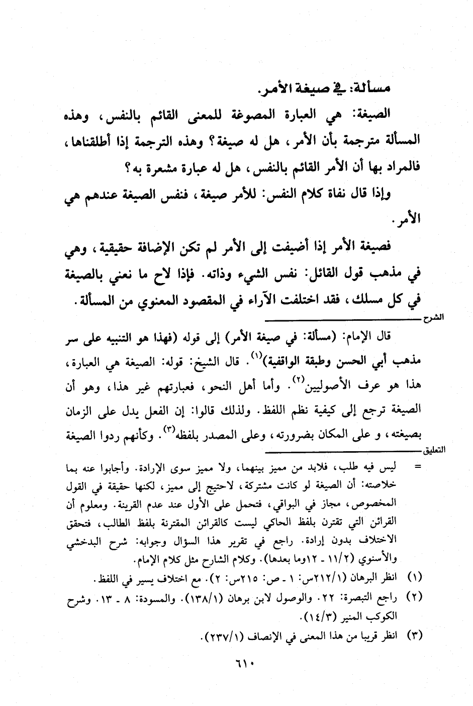 قال الإمام: (مسألة: في صيغة الأمر) إلى قوله (فهذا هو التنبيه على سر مذهب أبي الحسن وطبقة الواقفية). قال الشيخ: قوله: الصيغة هي العبارة، هذا هو عرف الأصوليين. وأما أهل النحو، فعبارتهم غير هذا، وهو أن الصيغة ترجع إلى كيفية نظم اللفظ. ولذلك قالوا: إن الفعل يدل على الزمان بصيغته، وعلى المكان بضرورته، وعلى المصدر بلفظه. وكأنهم ردوا الصيغة
