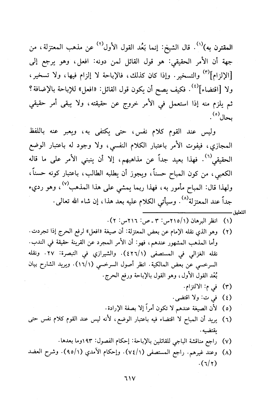 وليس عند القوم كلام نفس، حتى يكتفي بهن ويعبر عنه باللفظ المجازي، فيفوت الأمر باعتبار الكلام النفسي، ولا وجود له باعتبار الوضع الحقيقي. فهذا بعيد جدا عن مذاهبهم، إلا أن ينبني الأمر على ما قاله الكعبي، من كون المباح حسنا، ويجوز أن يطلبه الطالب، باعتبار كونه حسنا، ولهذا قال: المباح مأمور به، فهذا ربما يمشي على هذا المذهب، وهو رديء جدا عند المعتزلة. وسيأتي الكلام عليه بعد هذا، إن شاء الله تعالى.