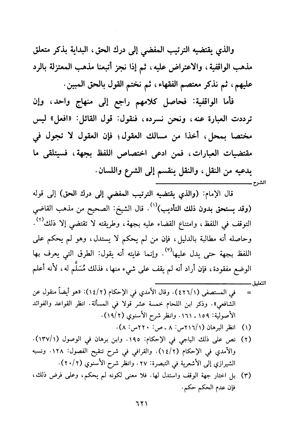 قال الإمام: (والذي يقتضيه الترتيب المفضي إلى درك الحق) إلى قوله (وقد يستحق بدون ذلك التأديب). قال الشيخ: الصحيح من مذهب القاضي التوقف في اللفظ، وامتناع القضاء عليه بجهة، وطريقته لا تقتضي إلا ذلك. وحاصله أنه مطالبة بالدليل، إن من لم يحكم لا يستدل، وهو لم يحكم على اللفظ بجهة حتى يدل عليها. وإنما غايته أنه يقول: الطرق التي يعرف بها الوضع مفقودة، إن أراد أنه لم يقف على شيء منها، فذلك مسلم له، لأنه أعلم