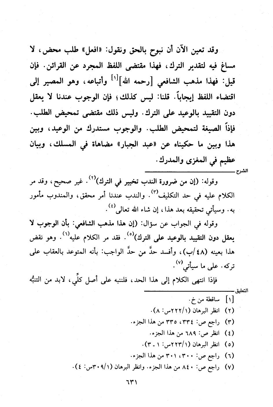 وقوله: (إن من ضرورة الندب تخيير في الترك). غير صحيح، وقد مر الكلام عليه في حد التكليف. والندب عندنا أمر محقق، والمندوب مأمور به. وسيأتي تحقيقه بعد هذا، إن شاء الله تعالى.